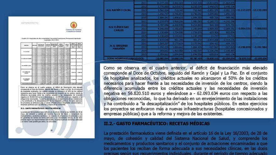 “La diferencia acumulada entre los créditos actuales y las necesidades de inversión negativa es de 56.820.510 euros [...], lo que ha derivado en un envejecimiento de las instalaciones y ha contribuido a 'la descapitalización' de los hospitales públicos”, afirma el documento al que ha tenido acceso eldiario.es a través del buzón seguro y anónimo Fíltrala. El anteproyecto ya se ha remitido, como marca el funcionamiento de la Cámara de Cuentas, a la Consejería de Sanidad (el órgano fiscalizado), que ha confirmado a eldiario.es que presentará alegaciones. Tiene 30 días para hacerlo.