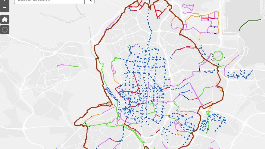 En este mapa del Ayuntamiento de Madrid están pintados en rojo los carriles exclusivos para bicicletas y en azul los ciclocarriles.