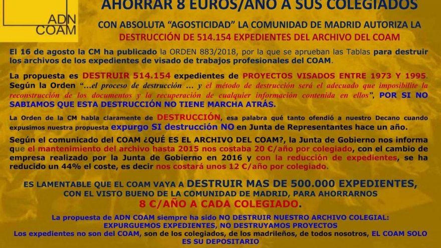 En pleno verano, varias asociaciones de arquitectos y archiveros saltaron a denunciarlo. “Con absoluta 'agosticidad', la Comunidad de Madrid autoriza la destrucción de 514.154 expedientes”, titulaba su comunicado ADN COAM, una asociación de colegiados crítica con la actual gestión. “La orden habla de 'destrucción', esa palabra que ofendió a nuestro decano cuando expusimos que expurgo sí, pero destrucción no”. “¿Pretende el COAM destruir su archivo?”, se preguntaba la federación de asociaciones de archiveros Anabad. “Las últimas noticias que recibimos señalan a una respuesta afirmativa. Sí”.