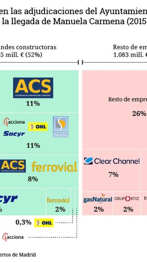 Las seis grandes constructoras españolas (ACS, FCC, Ferrovial, OHL, Sacyr y Acciona) se llevan uno de cada dos euros en adjudicaciones del consistorio madrileño desde la llegada de Manuela Carmena a la alcaldía en junio de 2015. En total, se llevaron la mitad de los 2.268 millones de euros adjudicados por el Ayuntamiento en ese periodo, según datos del Portal de Datos Abiertos del consistorio analizados por eldiario.es.