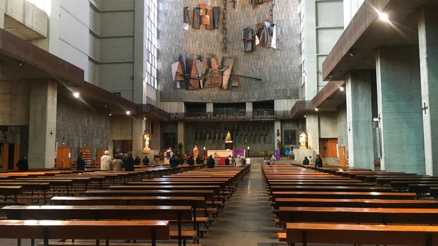 A la salida, el escaso reguero de personas que camina por la calle se divide entre las que deben ir a trabajar, las que entran por la puerta de los supermercados y las que se dirigen tarde a la Iglesia para la misa de las diez. Ese es el caso de Juana, feligresa de la Parroquia hispanoamericana de la Merced: “La misa se celebra en la cripta de abajo, que es más pequeña, pero lo han movido por la distancia de seguridad”. Así lo explica un cartel a la entrada de la Basílica, en la que atiende al sermón una veintena de personas, menos de las que normalmente acuden al primer servicio del día.