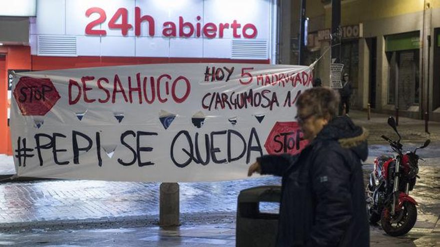 El bloque de Argumosa 11 se ha convertido en todo un símbolo en el barrio de Lavapiés. “La propiedad está repartida entre tres herederos y la empresa Proindivisos. No es exactamente un fondo buitre, sino lo que podríamos llamar una empresa patrimonial, creada ex profeso para comprar inmuebles a un precio inferior al de mercado, vaciarlos y luego especular con ellos. Es el facilitador del fondo buitre”, explica el portavoz de la Asamblea de Bloques en Lucha, que agrupa a varias asociaciones, Fernando Bardera. Así, tras dos décadas viviendo en uno de los pisos, la propiedad hizo a Pepi firmar un nuevo contrato “a la medida de lo que querían”, indica ella. “Me dijeron que me subían 100 euros, hasta los 400, y al año siguiente, otros 100. Yo ya dije que eso no lo podía pagar”, explica. “Se fuerza el no recibir la renta durante dos o tres meses para poder denunciar por impago”, apunta Bardera.