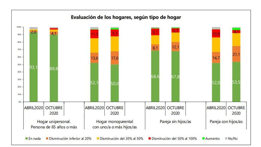 El resultado directo de estas circunstancias es la pérdida de ingresos. El estudio señala que, pasado el confinamiento y los meses más duros de la pandemia, la situación ha empeorado para una parte de la población: aumenta del 10 al 13% el porcentaje de hogares cuyos ingresos se han reducido hasta un 20%. Una de cada cinco parejas con hijos encuestadas están en esta situación. La proporción de familias que han visto mermada su capacidad económica entre un 20 y un 50% no ha mejorado. Se mantiene en un 14,7%.