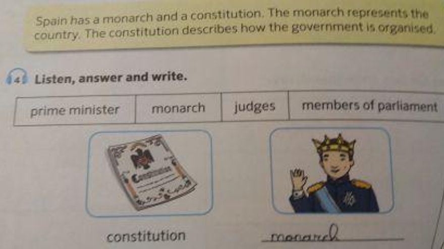 “España tiene un ______ y una constitución”, aparece en el repaso histórico en el que se tiene que señalar la respuesta correcta, entre 'monarca' y 'príncipe'. Junto a la frase, se encuentra una ilustración de la Constitución y de un rey. Las mismas imágenes vuelven a aparecer en las páginas del libro escolar, esta vez para un ejercicio de listening.