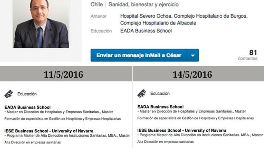 Gómez Derch fue nombrado jefe de la institución el 3 de mayo por el Gobierno de la Comunidad de Madrid presidido por Cristina Cifuentes (PP). Antes de esa fecha había dejado un rastro profesional en el que iba engordando sus méritos. Este directivo se ha atribuido el grado de “doctor en Ciencias Económicas y Empresariales” por la Universidad Complutense de Madrid. Así ha constado sin otro matiz en su perfil profesional de la red Linkedin hasta, al menos, el 11 de mayo. Así aparece en su perfil personal de Facebook. Y de esa manera ha sido presentado en diversas conferencias y cumbres en las que intervenía como ponente. Sin ir más lejos en la conferencia regional Sudamérica Summit sobre “colaboración en la nueva infraestructura de la salud” celebrada en 2015 no solo aparece como doctorado sino que se le asigna la calificación “cum laude”.
