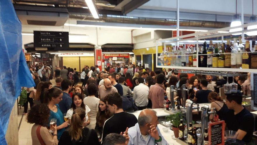Desde hace un tiempo, los fines de semana son sinónimo de fiesta en el mercado. A partir de las doce del mediodía los puestos se llenan de gente que va a tomar cañas o vermú y engancha una detrás de otra hasta las once (viernes y sábados) o hasta las cinco de la tarde (domingos). A partir de esa hora, “hay una masa de gente que sale a la vez y es acogida por los 'lateros' [vendedores ambulantes de cerveza]”, continúa Alberto. “Y esto se convierte en un botellón. Es Magaluf total”.