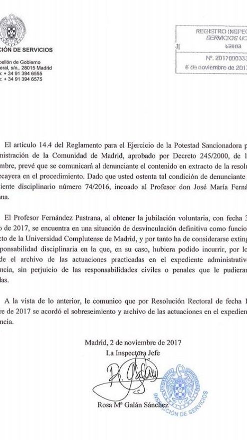 “El profesor Fernández Pastrana, al obtener la jubilación voluntaria, con fecha 31 de agosto de 2017, se encuentra en una desvinculación definitiva como funcionario respecto de la Universidad Complutense de Madrid, y por tanto ha de considerarse extinguida la responsabilidad disciplinaria que, en su caso, hubiera podido incurrir en el expediente administrativo de referencia”, dice el documento firmado por la inspectora jefa Rosa María Galván, que informa del “sobreseimiento y archivo de las actuaciones por Resolución Rectoral” el pasado 10 de octubre.