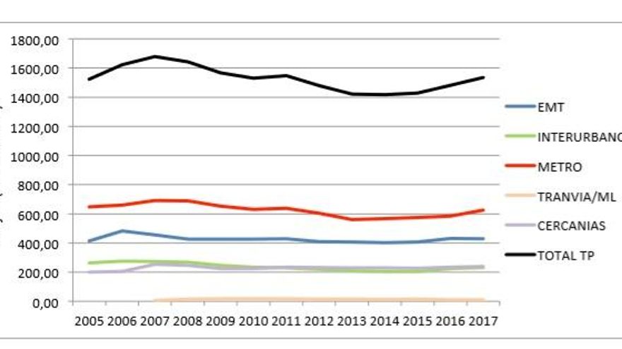Así, 2015 fue el primer año en positivo tras un largo periodo de caídas coincidente con la crisis económica: desde 2009 la demanda de Metro, Cercanías y autobuses se redujo un 14%. Pese a la tendencia creciente de los últimos tres años, los niveles de demanda aún no han logrado recuperarse. El uso de transporte público es menor, en número de viajes, al registrado en 2005 (1.623 millones), el pico más alto de la serie histórica.
