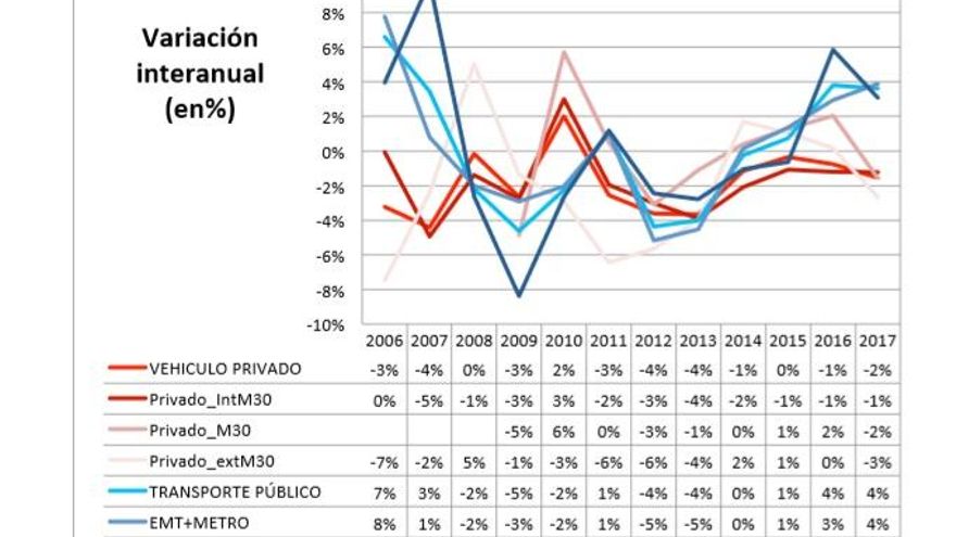 La bajada ha continuado también en los años de gestión del equipo de Manuela Carmena en el Ayuntamiento de Madrid. Los datos que maneja el área de Desarrollo Urbano Sostenible hablan de un descenso lento pero sostenido (un2%) en los últimos tres años. Esta tendencia a la baja contrasta con el aumento del uso de transporte público, que ha crecido un 7% en el mismo periodo. Según los datos del Ayuntamiento de Madrid, el número de viajes –tanto urbanos como metropolitanos– ha escalado de los 1.428 millones de 2015 a los 1.536,24 de 2017 en un cambio de tendencia al ascenso inaugurado hace un trienio.