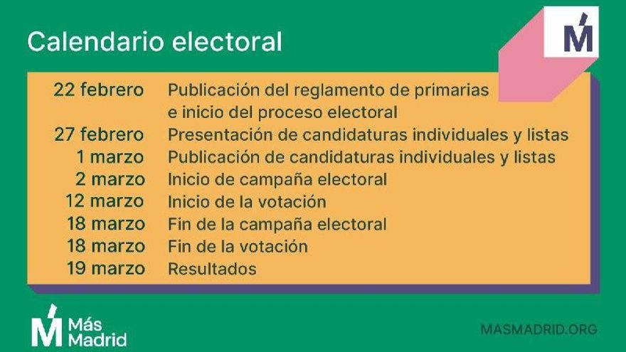 Antes de la fecha de votación, el 1 de marzo se hará pública quiénes serán los aspirantes a la Alcaldía y Presidencia de Madrid. A su vez, Más Madrid publicará el reglamento de las primarias este viernes 22 de febrero.