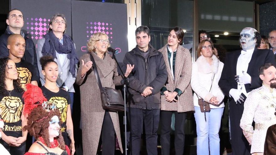 Carmena lo ha hecho desde las escalinatas del cine Callao donde ha compartido escalones con concejales de su Gobierno y de todas las formaciones del Consistorio (PP, PSOE y Ciudadanos), además de actores y actrices de los musicales de Gran Vía, en un acto en el que también ha inaugurado la Navidad con el encendido de las luces.