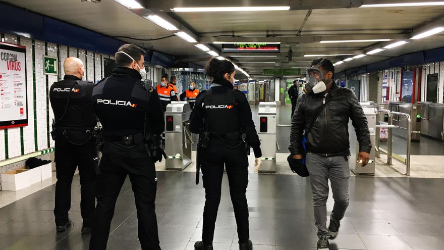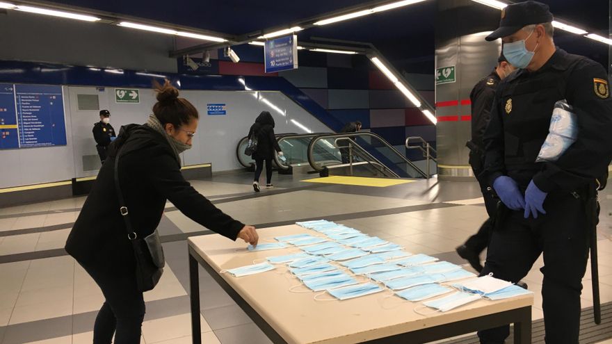 Para garantizar una mayor seguridad en el suburbano, el Gobierno ha desplegado a cuerpos y fuerzas de seguridad en 16 estaciones para repartir mascarillas de un solo uso. “Todavía es pronto, pero no parece que sea hora punta”, contempla Luis, uno de los policías. Su equipo ha empezado a las 6 de la mañana y está formado por agentes del turno de noche, a quienes avisaron ayer a última hora de su nueva misión en los próximos días. “No estamos muy cansados porque las madrugadas son tranquilas. No hay casi gente en las calles”, asume.