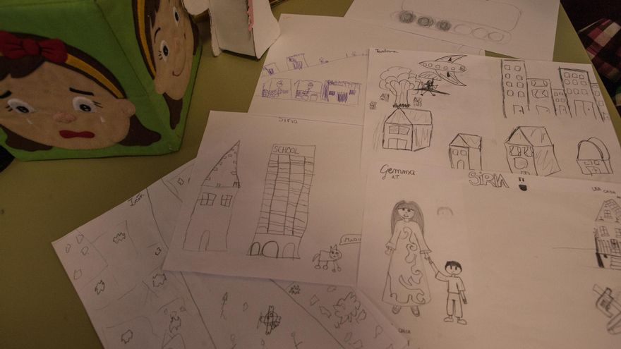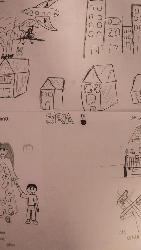 Nadine pide después a los alumnos que dibujen en un folio lo que ellos piensan sobre Siria. Los niños pintan casas y personas, uno de ellos recuerda que en un documental vio un ave carroñera, el ibis eremita, en extinción, que vivía en Siria, y la dibuja. Pero la mayoría trazan tanques, aviones que dejan caer bombas sobre los edificios, llamas y cristales rotos.