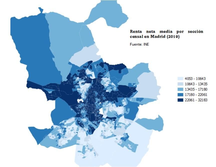 La ciudad de Madrid está considerada una de las más segregadas residencialmente de Europa. Así lo atestigua el estudio comparativo Socio-Economic Segregationin European Capital Cities: East Meets West en el que por la parte española participaron Daniel Sorando y Jesús Leal. Ello implica que las diferentes clases sociales que habitan la ciudad viven distantes entre sí, tal y como muestra el mapa de abajo. Mientras en el noroeste residen las personas con mayor poder adquisitivo, en el sureste reside la población más precaria de la ciudad.