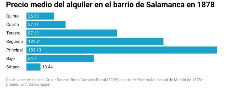 ¿Cómo era posible que en el mismo barrio convivieran personas de diferente clase social -y por tanto con muy diferente poder adquisitivo-? A través de la segregación vertical. Es decir, en los pisos principales vivían las personas con mayor renta y en los altos las más precarias. Borja Carballol lo cuenta muy bien en El despertar de una gran ciudad: Madrid. En él recopila los datos que se muestran en el siguiente gráfico, y que atestiguan las enormes diferencias de precio que había en el mismo bloque de edificios.