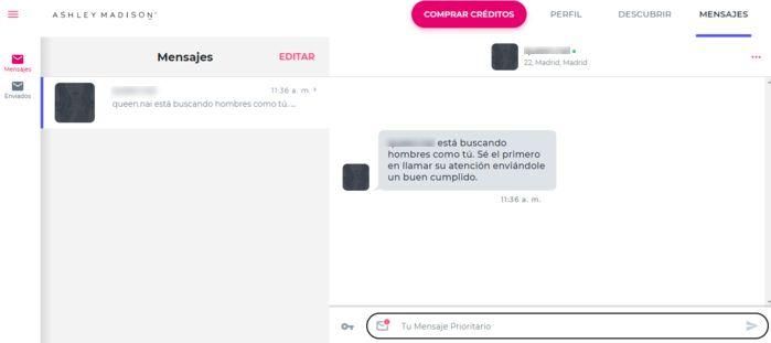Y por último, está el sistema de mensajería de Ashley Madison. Muy clásico en su uso, es rápido y fluido. Podrás encontrar rápidamente todas las conversaciones con otras personas en el sitio. Puedes elegir entre enviar mensajes normales (8 créditos) o mensajes prioritarios (13 créditos), que permiten a los usuarios ver los mensajes más rápidamente, ya que aparecen por encima de los demás en la lista.