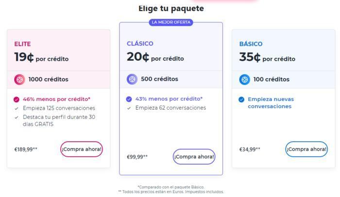 En concreto, un paquete de 100 créditos te permite iniciar 12 conversaciones, un paquete de 500 créditos te permite iniciar 62 y un paquete de 1000 créditos te permite iniciar 125 conversaciones. El precio de los créditos es bastante elevado, por lo que es importante utilizarlos con moderación (no hay límite en el número de créditos que puedes usar).