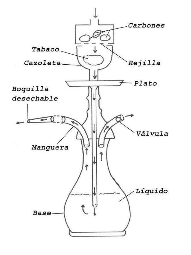 Conocidas también como shishas o narguiles, las cachimbas cuentan con una estructura que permite que el tabaco o la sustancia que se desee fumar pase por un líquido que sirve para filtrarlo. Sus partes son las siguientes: