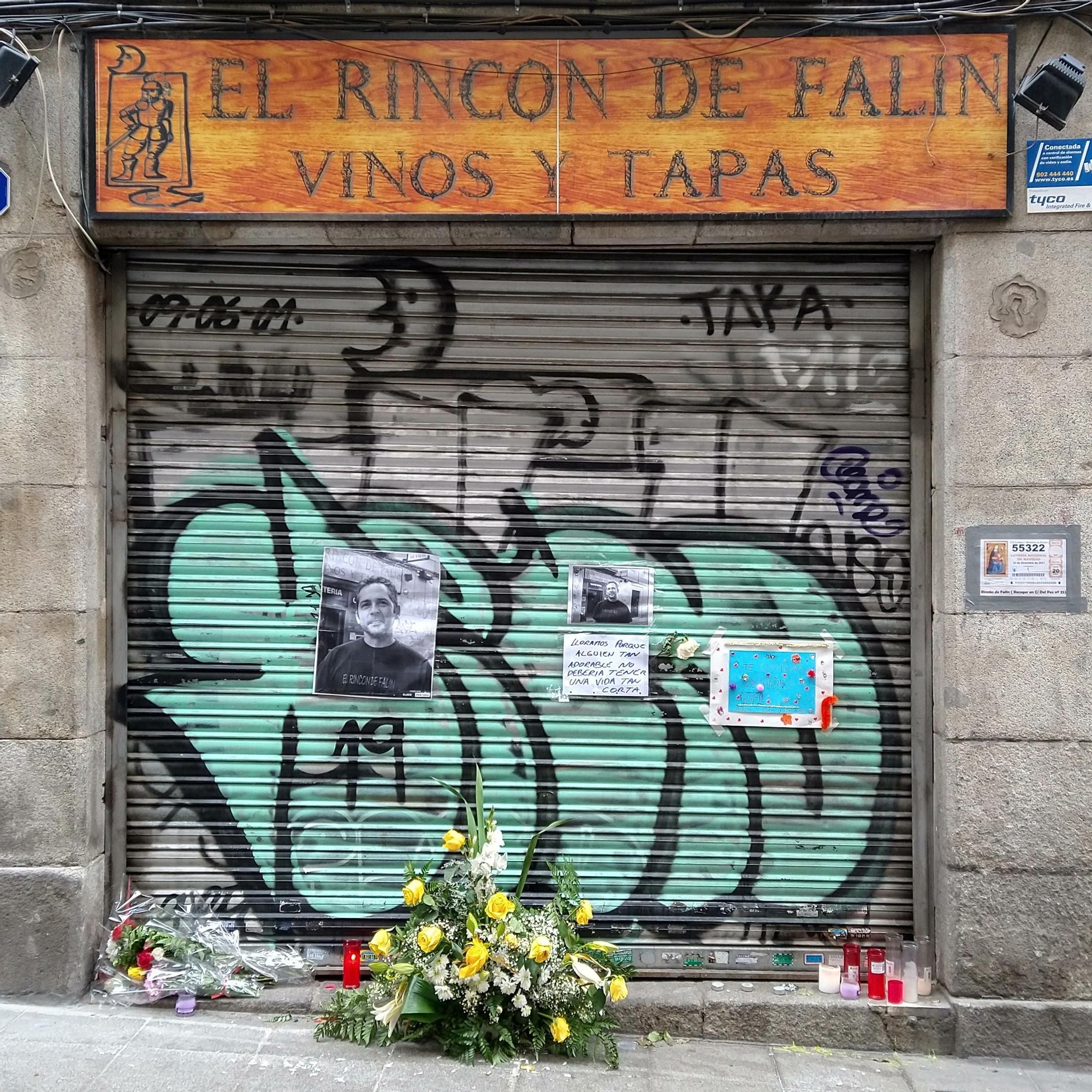 Un ramo de flores, varios carteles y fotos adornan desde hace unos días la persiana del Rincón de Falin, el único bar de la calle Pizarro. “Lloramos porque alguien tan adorable no debería tener una vida tan corta”, indica uno de los folios pegados a la persiana, al que está unido un clavel. “Te echaremos de menos Rafa”, añade otra cartulina coloreada por niños, a su lado.