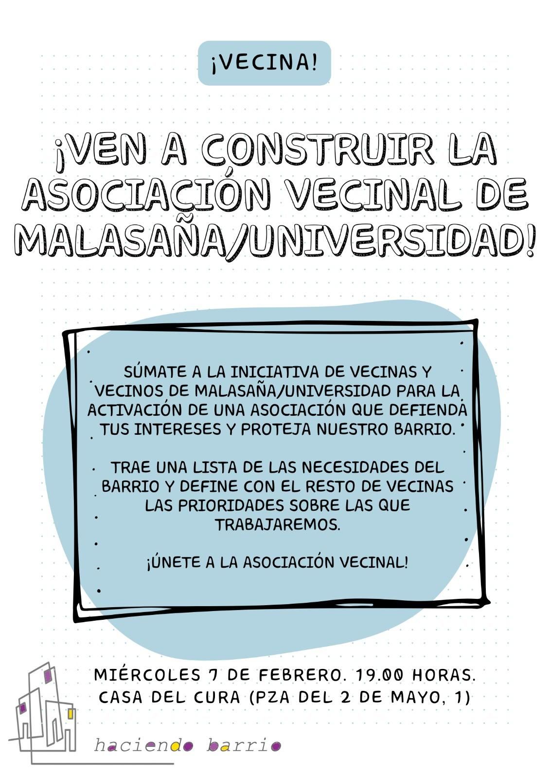El barrio de Malasaña está pasando desde hace tiempo por una situación complicada en cuanto a multitud de problemáticas y necesidades. Por eso, un grupo de vecinas y vecinos del barrio de Malasaña/Universidad se encuentra trabajando en las vías de actuación prioritarias de la que será la nueva asociación vecinal.
