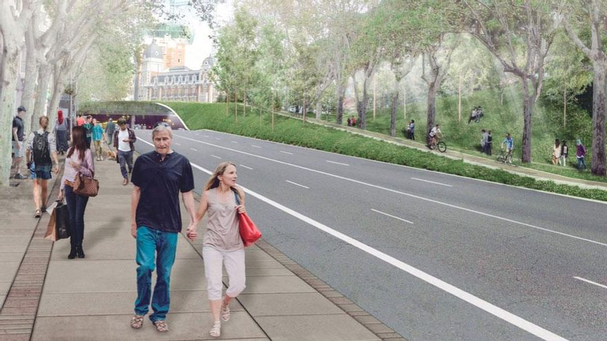El proyecto presume de que las zonas peatonales constituirán el 90% del espacio de la plaza, que se llegará desde la Gran Vía al Palacio Real en cinco minutos a pie y que se conectará con Madrid Río de forma directa, sin obstáculos ni carreteras.