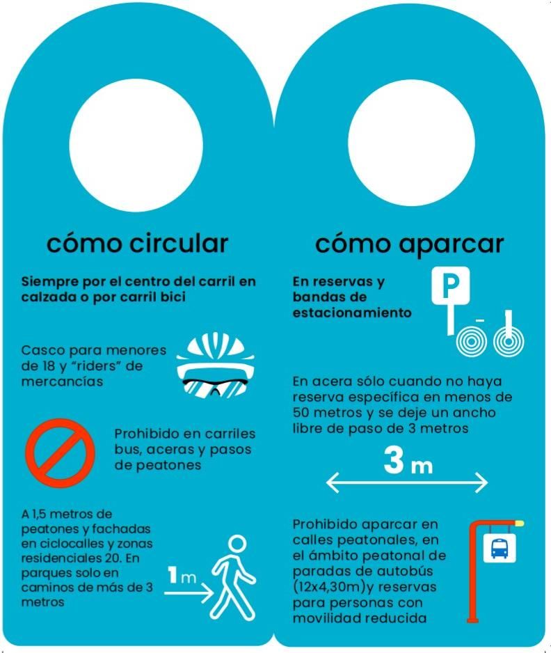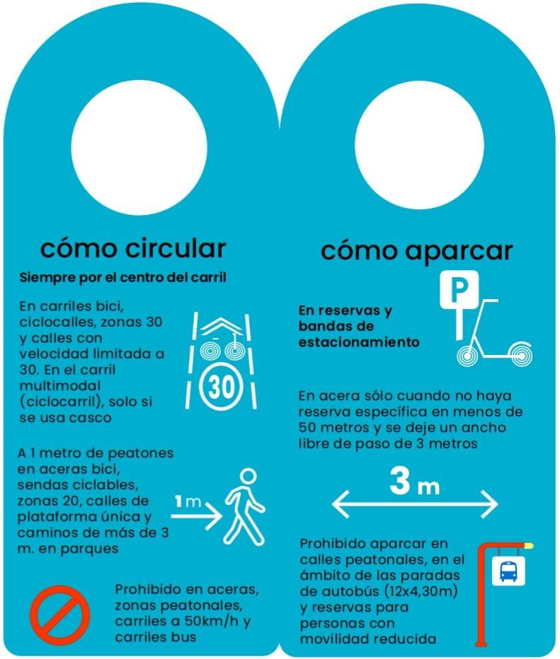 - Patinetes: informa de que hay que circular por carriles bici, ciclocalles, zonas 30 y calles con velocidad limitada a 30 km/h. Nunca en aceras, zonas peatonales, carriles a 50 km/h ni carriles bus. En el carril multimodal, los ciclocarriles, solo podrán circular con casco. Al pasar cerca de un peatón en aceras-bici, sendas ciclables, zonas 20, calles de plataforma única o caminos de más de tres metros en parques, tendrán que guardar una distancia de un metro. Para aparcar, su sitio son las reservas y bandas de estacionamiento. En acera solo cuando no haya reserva específica en menos de 50 metros y se deje un ancho libre de paso de tres metros. Está prohibido aparcar en calles peatonales, en el ámbito de las paradas de autobús y reservas para personas con movilidad reducida.