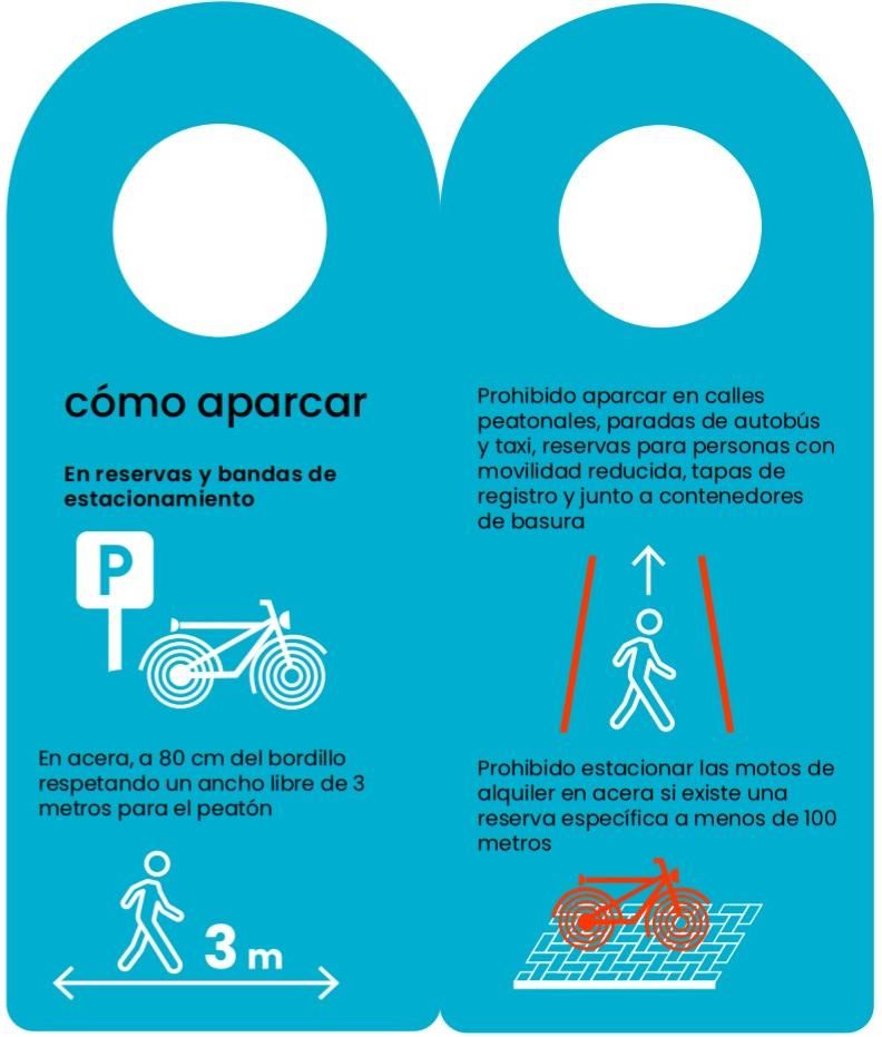 - Motos: El díptico insiste en los lugares de aparcamiento. Su sitio son las reservas y bandas de estacionamiento. Está prohibido aparcar en calles peatonales, paradas de autobús y taxi, reservas para personas con movilidad reducida, tapas de registro o alcantarillas y junto a contenedores de basura. Los dípticos insisten en que la moto solo se aparca en acera como última ubicación y dejando 80 centímetros del bordillo, respetando un ancho libre de tres metros para el peatón. Si la moto es de alquiler, está prohibido aparcar en acera si existe una reserva específica da menos de 100 metros.