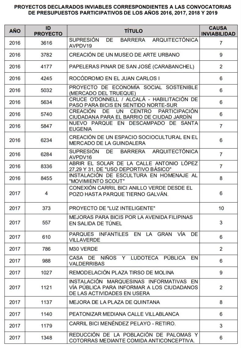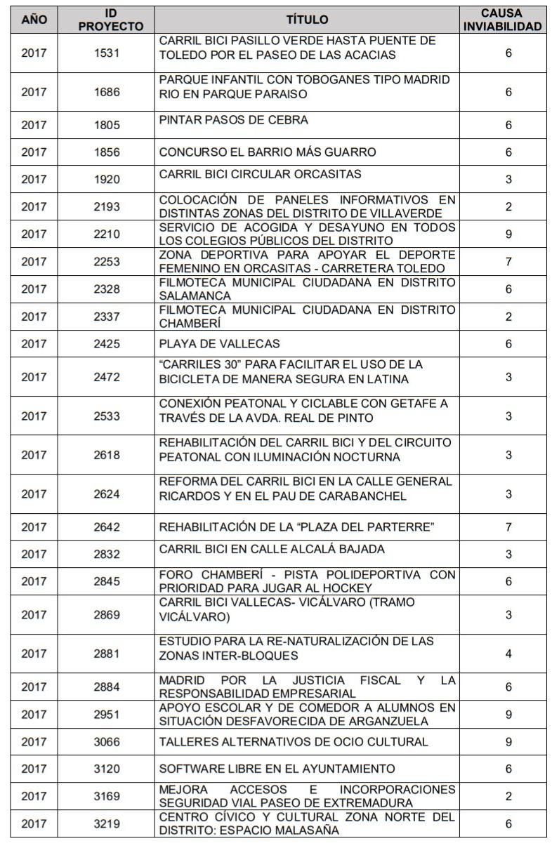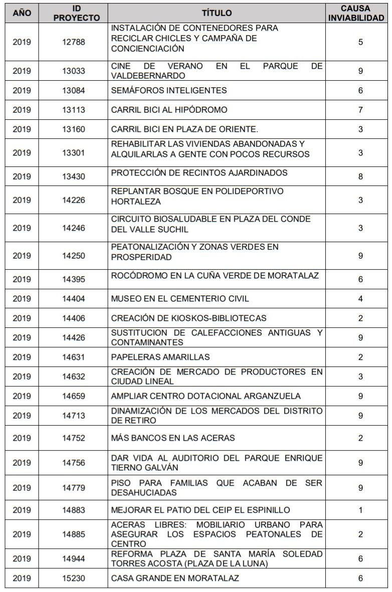 La lista negra ha menguado ligeramente respecto a los 232 proyectos que se tumbaron inicialmente, después del periodo de alegaciones o de la adecuación de algunas iniciativas a actuaciones en curso del propio Ayuntamiento de Madrid. En este sentido el área de Vicealcaldía, que dirige Villacís y de la que depende Participación, ha salvado en el último momento once iniciativas ciudadanas, que se publican en el BOAM junto a las descartadas. Entre ellas figuran un mercado del arte en Carabanchel, la creación de un espacio musical en Valderribas o la reparación de aceras en Moratalaz.