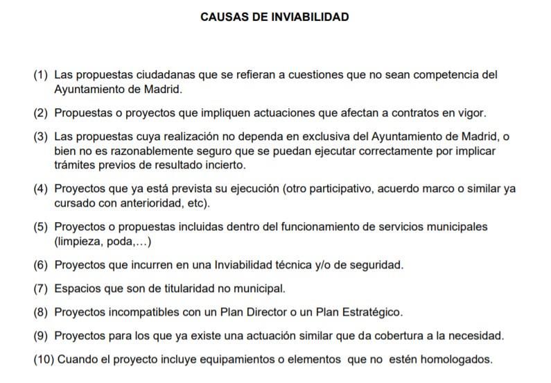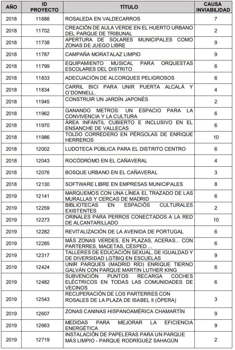 El Ayuntamiento de Madrid justifica con diez causas las razones técnicas para echar abajo propuestas ciudadanas que fueron validadas previamente, antes de las votaciones, por los servicios técnicos municipales durante la etapa de Ahora Madrid en la alcaldía. La más común es la de “inviabilidad técnica y/o de seguridad”, un motivo que se aplica a uno de cada tres proyectos descartados. También se aplican otras razones como la de que implican “trámites previos de resultado incierto” o que afectan a contratos municipales ya en vigor.