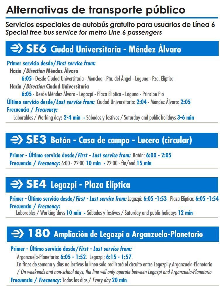 Todas las paradas de la línea se cubren con un servicio sustitutivo de autobús, el SE6, que está operado por la EMT (buses azules) y es gratis.