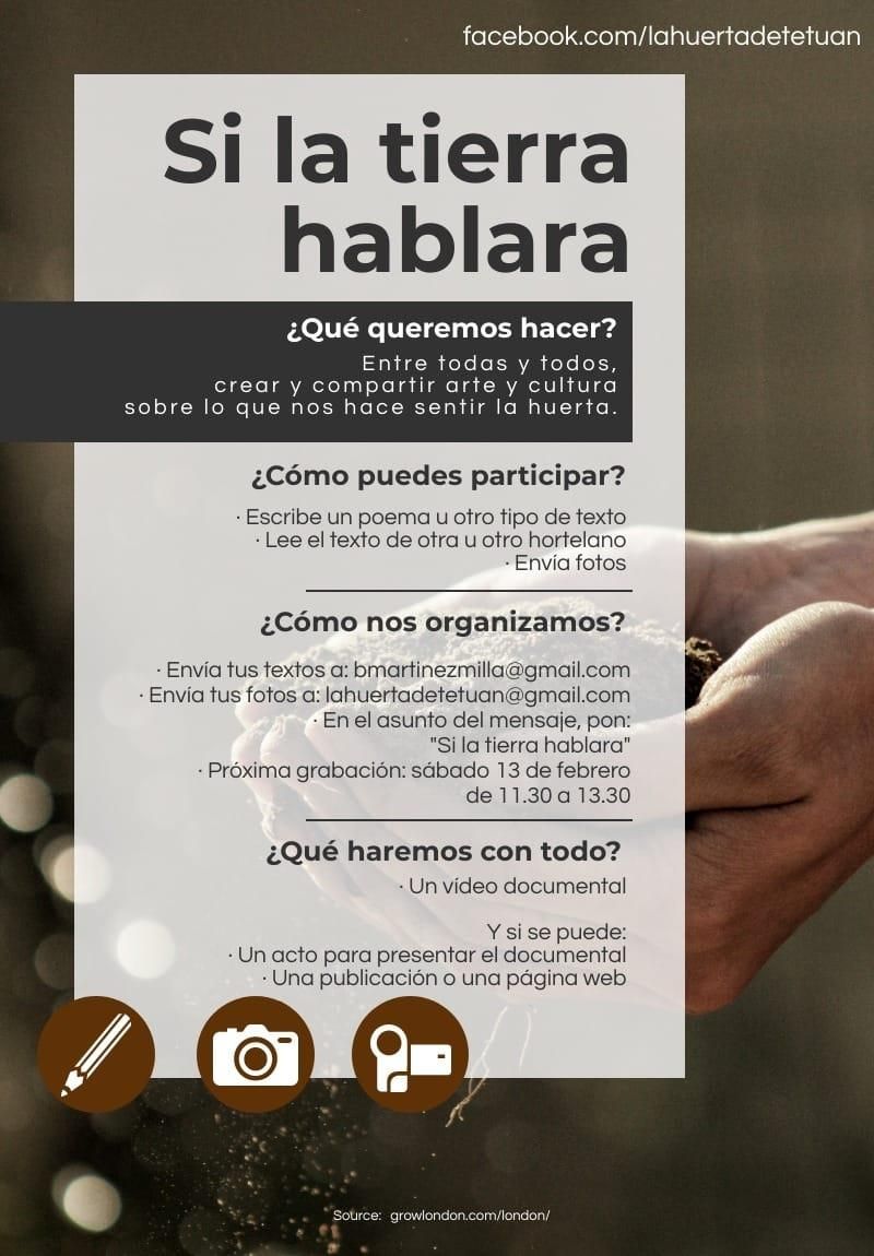 La gente de la Huerta de Tetuán apenas ha terminado de poner la huerta a punto tras la tormenta de nieve y ya está en marcha, pensando actividades para dinamizar el distrito. Su nuevo proyecto se llama Si la tierra hablara y consiste en una convocatoria para que todos los hortelanos y hortelanas compartan con su arte –textos o fotos– lo que les hace sentir la huerta.