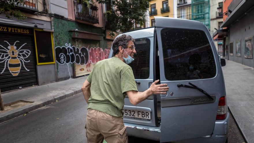 “Llevo y traigo comida”, comienza Mariano, que antes era carpintero y ahora… “ahora soy esto”. Utiliza su furgoneta gris para agilizar las donaciones, que vienen de carnicerías, supermercados, fruterías y todo tipo de locales del barrio donde personas particulares hacen una compra extra para el banco de alimentos. “Hay muchos comercios que donan, y si es mucho me mandan a mí. También llevo comida a los que no pueden salir de casa, a enfermos, a ancianos a familias con niños…”, habla a toda velocidad mientras carga, descarga y vuelve a montarse en el vehículo.