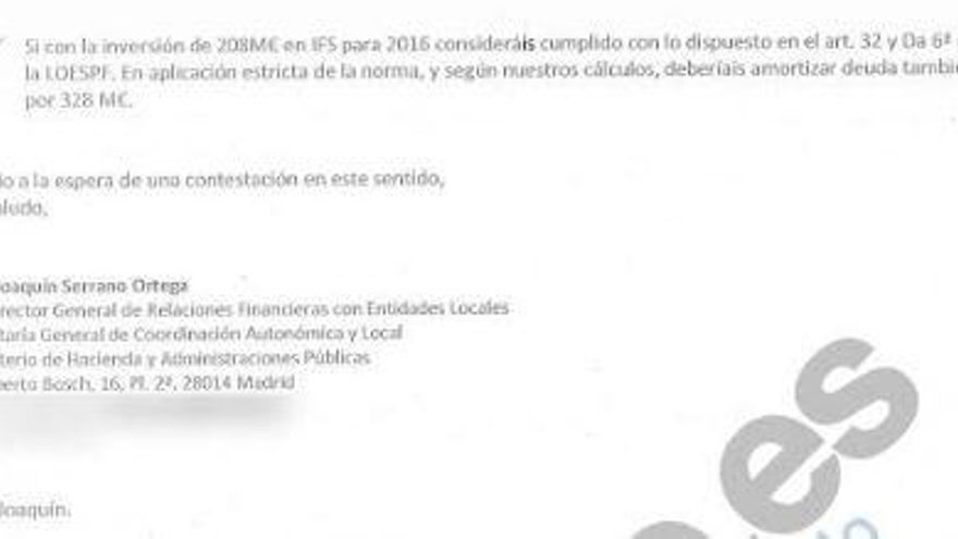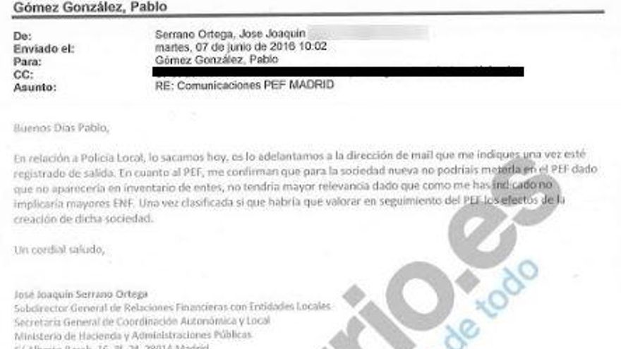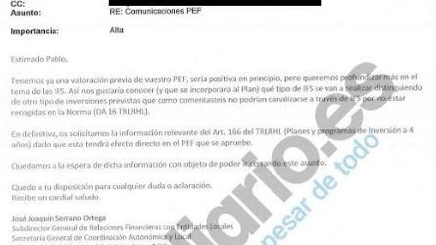 “Estimado Pablo. Tenemos ya una valoración previa de vuestro PEF (plan económico), sería positiva en principio, pero queremos profundizar más en el tema de las IFS (Inversiones financieramente sostenibles)”, aseguró el subdirector general del Ministerio en un email remitido al director general de Hacienda del Ayuntamiento. Serrano solicitó información sobre esas inversiones “dado que esta tendrá efecto en el PEF que se apruebe”, aseguró. “Quedamos a la espera de dicha información con objeto de poder ir cerrando este asunto”, concluyó el cargo de Hacienda en ese intercambio de mensajes al director general del Ayuntamiento al que ha accedido este diario.