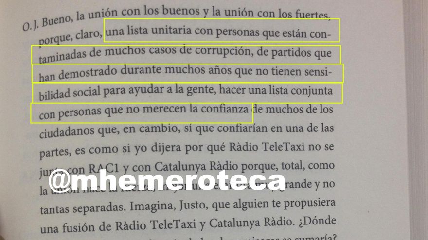 No es el único que ha acabado en la lista de Junts Pel Sí en contra de una voluntad manifestada en el pasado. Oriol Junqueras, líder de ERC, también dijo que no participaría de una lista unitaria en la que hubiera partidos contaminados por la corrupción. Lo decía en un libro de conversaciones con Justo Molinero (y sí, en Maldita Hemeroteca nos lo hemos leído):