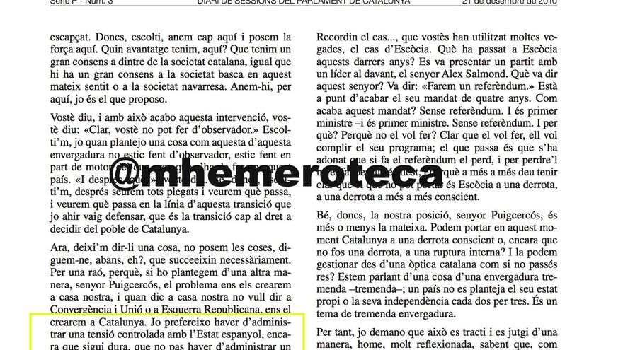 Y luego ya esta Artur Mas, que ahora se envuelve en la estelada y se alía con ERC en la defensa de la independencia, a pesar de haber dicho en el pasado que él prefería “administrar una tensión controlada con el Estado español que tener que administrar una ruptura de la cohesión dentro de Cataluña”administrar una tensión controlada con el Estado español que tener que administrar una ruptura de la cohesión dentro de Cataluña. Lo dijo en su discurso de investidura del año 2010 en su respuesta al líder de ERC de entonces, Joan Puigcercós: