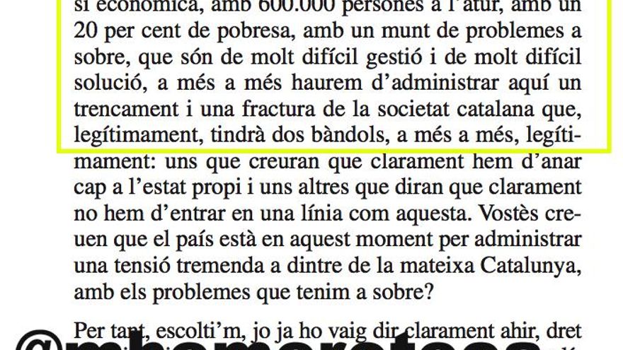 Iba incluso más allá. Planteaba que bastantes problemas de paro y pobreza tenía ya Cataluña como para encima tener que gestionar el conflicto de una Cataluña dividida en dos: