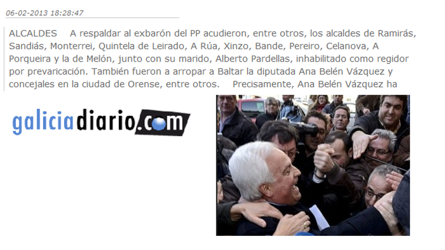 Medio centenar de alcades se dieron cita junto con concejales y militantes populares acudieron en el juzgado para apoyar a José Luis Baltar, uno de los últimos caciques gallegos y el ex presidente de la Diputación de Ourense. Estaba imputado por un delito continuado de prevaricación. También una diputada nacional acudió a arropar a Baltar, Ana Belén Vázquez, “estamos totalmente seguros de su inocencia” dijo a los medios. Baltar acabó condenado por enchufismo