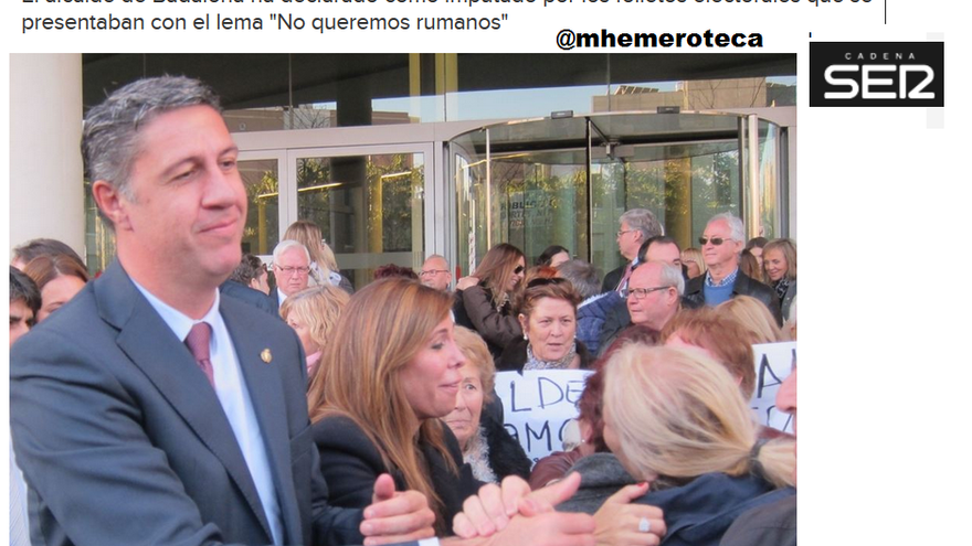 2013. Xabier García Albiol fue imputado por xenofobia a consecuencia de sus folletos que vinculaban inseguridad e inmigración. Claro que para el PP esa imputación se debía a una “denuncia política” del “tripartito”. Tampoco estuvo solo: la entonces líder del PP catalán, Alicia Sánchez Camacho y políticos como Alberto Fernández Díaz estuvieron a su lado junto unas 200 personas que le esperaban a la salida del juzgado con pancartas de apoyo.