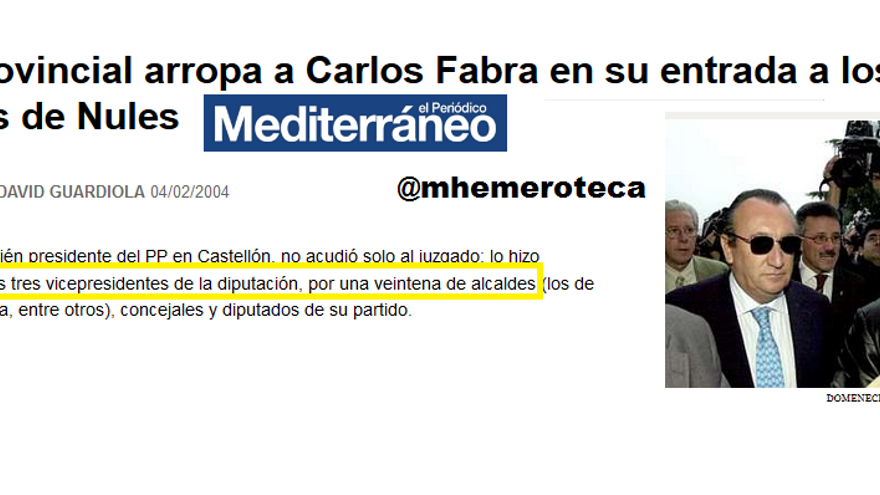 Carlos Fabra, ahora en prisión, acude al juzgado imputado por prevaricación, cohecho, malversación y tráfico de influencias. Es 2004 y el PP no le deja solo. A Fabra lo acompañan los tres vicepresidentes de la diputación de Castellón, por una veintena de alcaldes, concejales y los diputados del Partido Popular en el Congreso Miguel Barrachina, Juan José Ortiz y José Ramón Calpe.