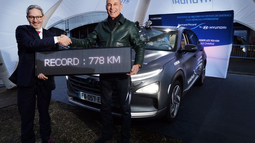 El Nexo, a la venta en España por 68.000 euros, homologa en el ciclo WLTP una autonomía de 666 kilómetros, que Piccard ha logrado estirar hasta los ya citados 778 kilómetros. El pionero vehículo de Hyundai incorpora tres tanques de hidrógeno, con capacidad para unos 52 litros cada uno, alojados bajo el piso allí donde se posan los pies de los ocupantes traseros. La batería está colocada en el maletero y el motor eléctrico, de 163 CV, entre las ruedas delanteras, debajo de donde se halla también la pila de combustible.