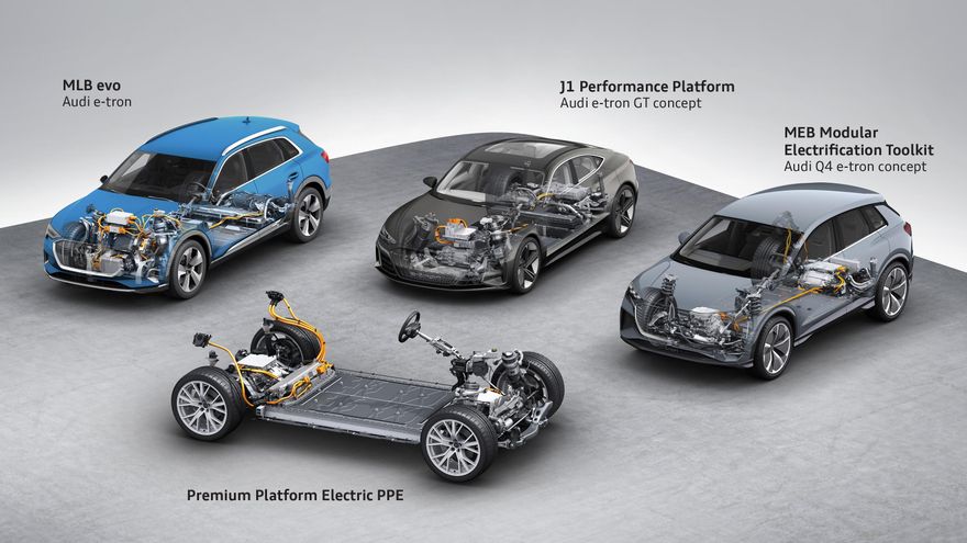 La plataforma denominada MLB evo sirve de base a modelos SUV de gran tamaño y ya fue usada, convenientemente adaptada, en la construcción del e-tron, el primer eléctrico de la marca. La conocida como J1 (Performance Platform) la compartirán coches de altas prestaciones como el Porsche Taycan y el futuro Audi e-tron GT, y la versátil MEB, común para todo el Grupo Volkswagen, es la que encontramos en el VW ID.3, el Seat el-Born y el Audi Q4 e-tron. Por último, la Plataforma Premium Eléctrica (PPE) se situaría a mitad de camino entre la J1 y la MEB y estaría dedicada a vehículos eléctricos de tamaño medio como el hipotético A5 e-tron.