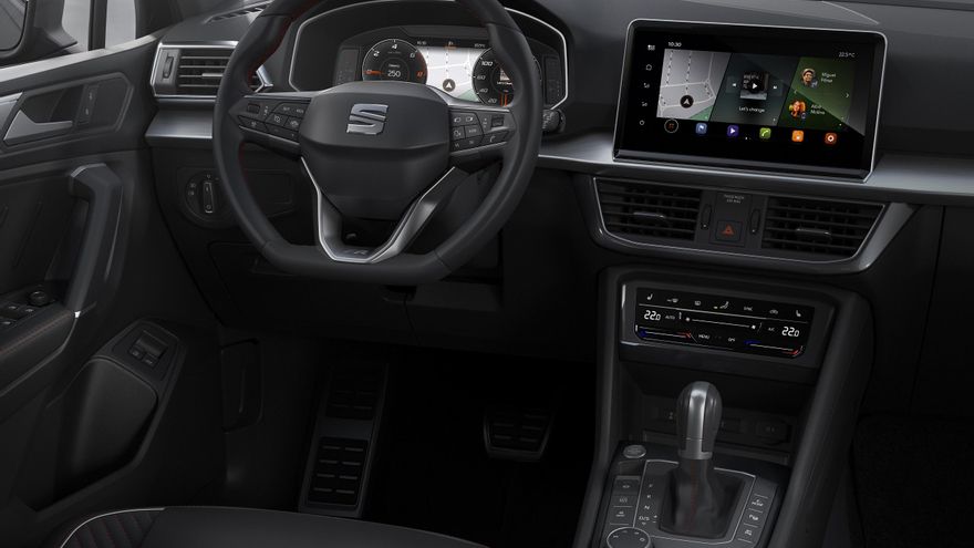Los pedales del Tarraco PHEV son de aluminio y el volante deportivo, pespunteado de rojo, incluye el logotipo FR y una inserción cromada en la posición de las 12 en punto que es común en los vehículos de carreras.
