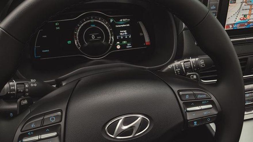 En el interior, lo más novedoso es un cuadro de mandos de alta resolución, completamente digital, y de siete pulgadas de diámetro. Como es lógico por su naturaleza de eléctrico, el Kona EV incorpora indicadores específicos de medición, tales como el velocímetro, el nivel de carga de la batería, el gráfico del fluido de la energía y el modo de conducción para el usuario. También es destacable un maletero que apenas pierde capacidad de carga, con 332 litros (373, contando el hueco para guardar el cable de carga) por los 361 de un Kona de gasolina y tracción delantera.