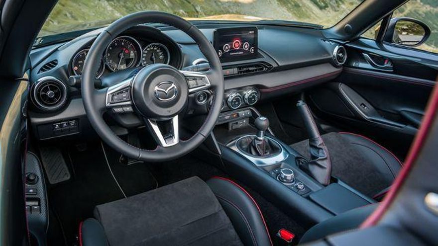En cuestión de diseño, lo más notable son los nuevos colores de las llantas de aleación y la capota de lona de color marrón que ahora está disponible en la versión especial MX-5 Soft Top Nappa Edition. Más valor tienen los cambios que acoge el interior, particularmente la incorporación de regulación en profundidad del volante (una crítica recurrente en generaciones precedentes) y de los estándares de conectividad Apple CarPlay y Android Auto.