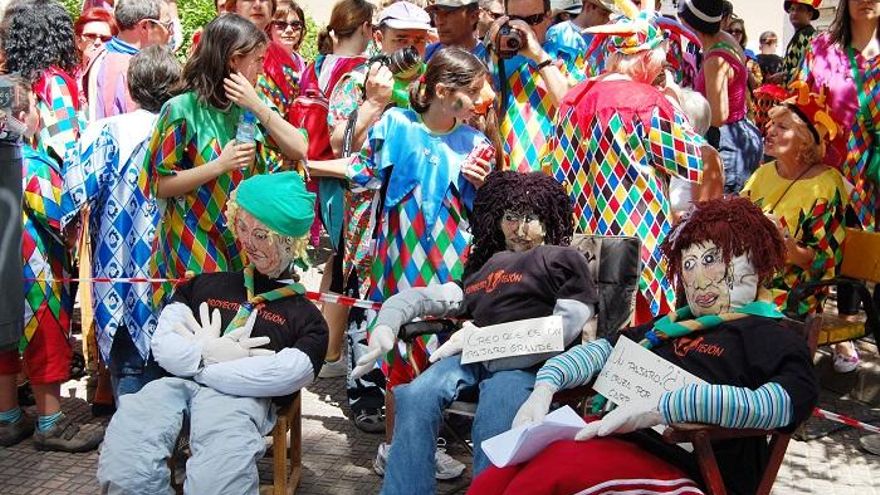 Los llamados Mayos son unos peleles o muñecos de trapo confeccionados a tamaño natural, simulando figuras humanas y colocados en las puertas de las casas, parques, jardines y cualquier otro rincón de la localidad. Cada Mayo compone una escena en la que los personajes interactúan a través de mensajes escritos en cartelas, generalmente en verso, recuperando vocablos, modismos y expresiones típicas de otra época.