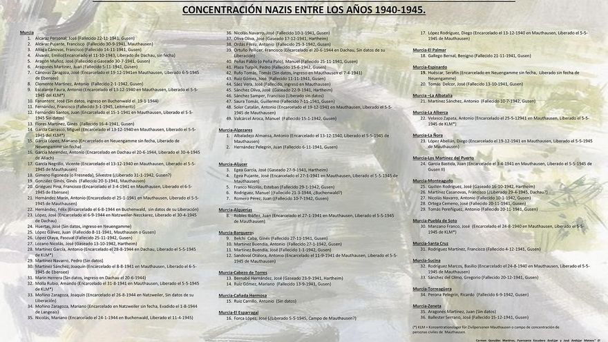 Las investigaciones recientes cifran en unas 500 personas de Murcia y su provincia las que tuvieron la desgracia de conocer in situ, de cerca, el terror nazi, con muy pocos supervivientes.  Del municipio de Murcia, se tiene constancia de que fueron 85 (49 de Murcia-ciudad y 36 de las pedanías), de los que salvaron la vida algo más de 30. Al día de hoy, quedan dos murcianos supervivientes, Juan Aznar, de Barranda, y Paco Griéguez, de Murcia, ambos centenarios.