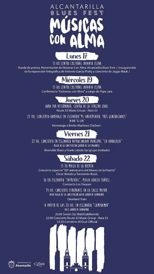Los conciertos que se van a celebrar durante toda la semana tendrán lugar en diversos escenarios ubicados por todo el municipio de Alcantarilla y contarán con artistas de la máxima relevancia regional, entre los que destaca el histórico Emilio Chicheri, miembro y fundador de históricas bandas murcianas como Accésit, Acequia, Los Bluesfalos o Stop Blues Band y actualmente con Emilio Chicheri y los trotacarretas, quien será homenajeado el jueves 20 en el histórico bar El Cepo, con la presencia de los conocidos Santiago Campillo, también antiguo componente de Acequia, y Pedro Casanova.