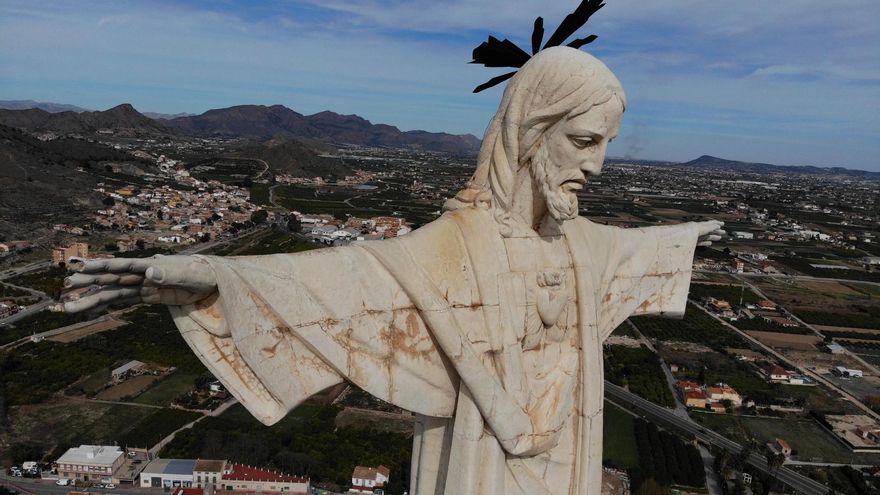 La asociación realiza esta petición tras conocer unas imágenes en el marco de su investigación sobre el complejo patrimonial de Monteagudo, en las que se puede apreciar numerosos daños en la imagen del Cristo situado en la coronación del cerro. Las fotografías muestran pérdidas de materiales, incluida la falta de una falange de un dedo y del recubrimiento de otro, así como numerosas grietas, humedades, corrosión y muestra de daños por toda la estatua.