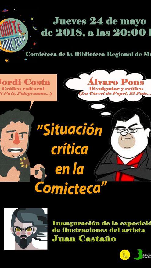 La programación de 'Comité Comicteca' continúa en la Biblioteca Regional de Murcia, de la mano de la Consejería de Turismo y Cultura, con un nuevo encuentro titulado 'Situación crítica en la Comicteca'. La actividad está programada desde el jueves, 24 de mayo (20:00 horas), y contará como protagonistas con Jordi Costa y Álvaro Pons, dos de los críticos más relevantes del país.