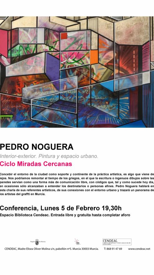 El artista murciano Pedro Noguera participa el lunes 5 de febrero a las 19:30 en el ciclo “Miradas Cercanas”, organizado por el Centro de Documentación y Estudios Avanzados de Arte Contemporáneo (Cendeac), con la charla Interior-exterior. Pintura y espacio urbano.